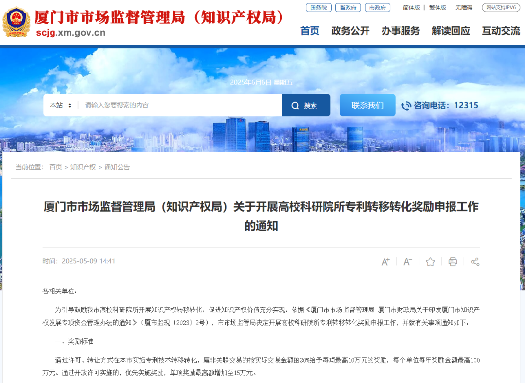 厦门市于近期启动高校科研院所专利转移转化奖励申报,申报材料提交截止时间为6月13日(以寄出日为准)。根据相关办法,通过许可、转让方式实施专利技术转移转化目属非关联交易的,按实际交易金额的30%给予每项最高10万元奖励,单个单位每年最高100万元;通过开放许可实施的,优先实施奖励,单项奖励最高额增加至15万元。项目需完成专利权转移或许可合同备案,每件专利仅限首次交易获奖励。(厦门市市场监督管理局(知识产权局))