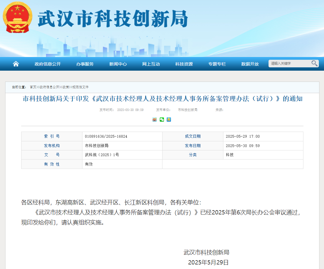 近日,武汉市科技创新局发布了《武汉市技术经理人及技术经理人事务所备案管理办法(试行)》,这也是2025年全国首个支持技术经理人事务所发展的新政。