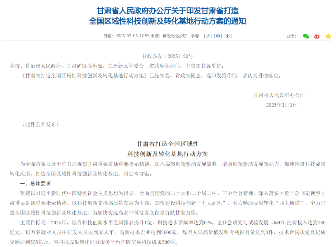 甘肃省政府办公厅印发了《甘肃省打造全国区域性科技创新及转化基地行动方案》,为甘肃科技创新发展明确了清晰的路线图和时间表。到2025年底,科技进步贡献率要达到62%,全社会研究与试验发展(R&D)经费投入达到180亿元,高新技术企业达到2600家,每万人口高价值发明专利拥有量达到3件,技术合同认定登记成交额达到525亿元。到2030年,R&D经费投入达到280亿元,每万人口高价值发明专利拥有量达到4.5件,省科技成果转化综合服务平台挂牌交易科技成果累计达到3000项,综合科技创新水平进入全国前20位,高水平建成全国区域性科技创新及转化基地。(兰州日报)