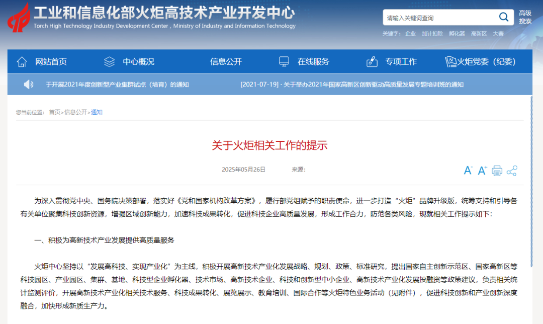 近日,工业和信息化部火炬高技术产业开发中心官网发布《关于火炬相关工作的提示》。提示明确火炬中心将进一步打造“火炬”品牌升级版,统筹支持和引导各有关单位聚集科技创新资源,增强区域创新能力,加速科技成果转化,促进科技企业高质量发展,同时也指出将坚决防范各类风险。